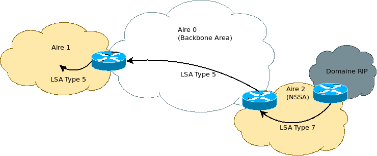 - NSSA : Aire de type stub qui apprend des routes externes par un autre moyen qu’OSPF. Les routes dans l’aires sont de type N2 et ré-émises par l’ABR de type E2.