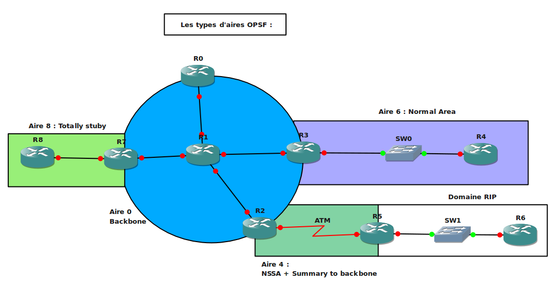 Il y a plusieurs types d’aires OSPF. Ces différents types impliquent un fonctionnement différent avec des informations à partager différentes.