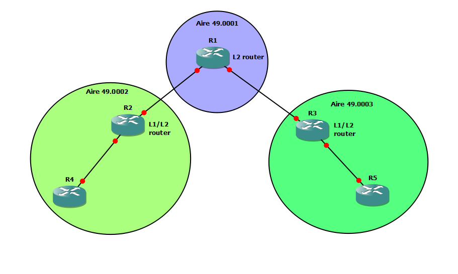Cela implique donc qu’il n’y a pas d’ABR au sens propre du terme en IS-IS. Il n’y a pas de routeur avec des interfaces dans deux aires différentes.
