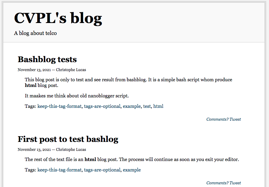 For now I will not move from this blog motor, but I have tested bashblog because I have made some search of my really old blog post and it make me think about nanoblogger which is not ever maintained now. So I search only for curiosity if there is now this kind of project. Bashblog is this kind of work. Only some bash and a quick result.