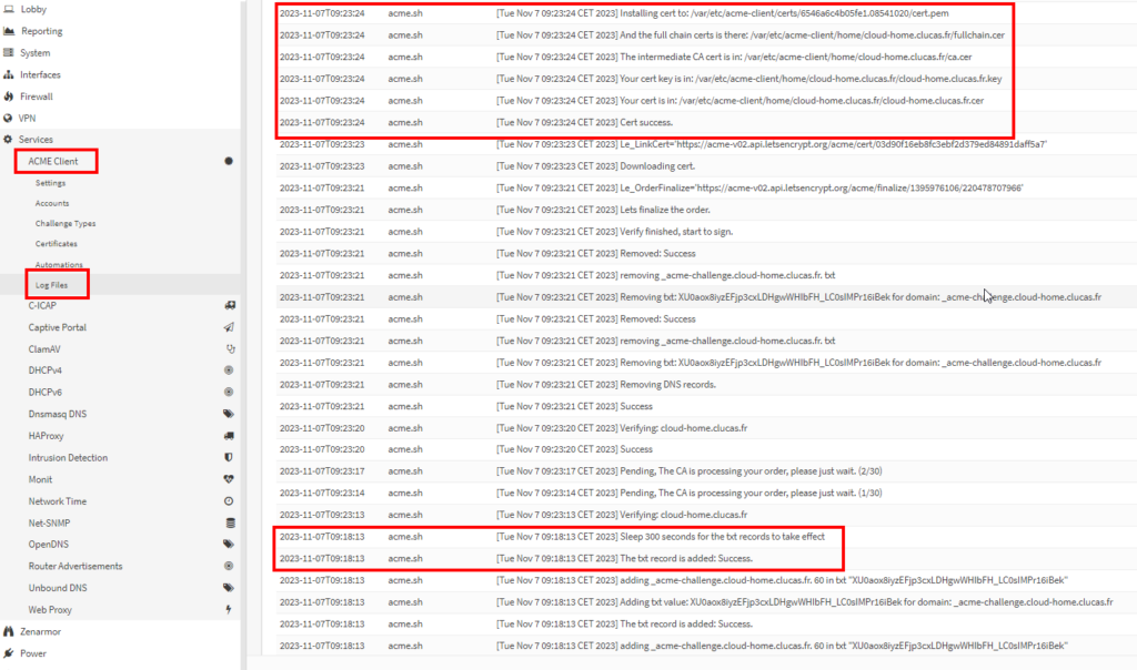 Nov 6 11:55:25 Sagitarius named[121]: client @0x7f68640d5860 10.20.3.1#59062/key opnsense: updating zone 'clucas.fr/IN': adding an RR at '_acme-challenge.cloud-home.clucas.fr' TXT "eOTvsiOSI0I0eenYb2hfiD0KAAf2kXSPZjDo_5IY1yQ"